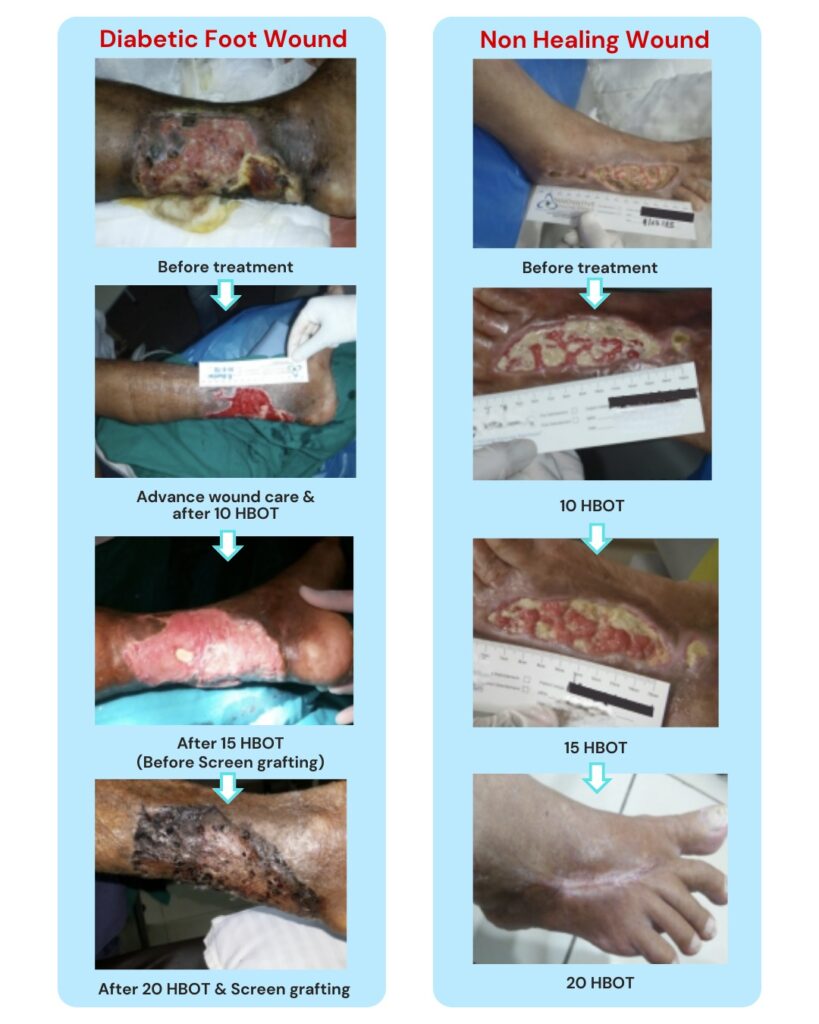 Hyperbaric Oxygen Therapy (HBOT) stimulates fibroblasts and osteoblasts to synthesize collagen and osteoid matrix to accelerate wound and bone healing by overcoming the hypoxic conditions present in some chronic wounds and non-healing bone. Arterial and venous ulcers, diabetic foot ulcers, chronic refractory osteomyelitis and slowly healing fractures ben